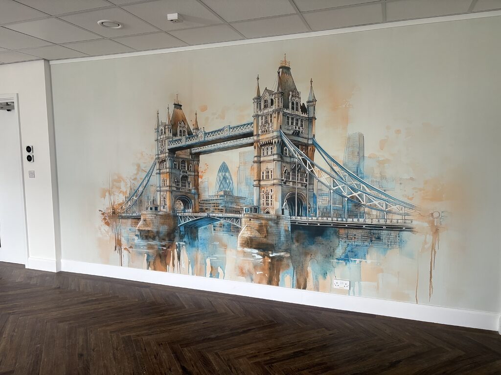 O mural da London Bridge fica ótimo na nossa sala de reuniões.
