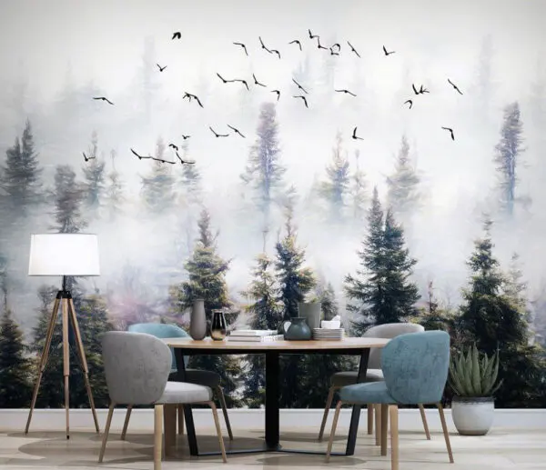 14.60 €8.76 €Papel de parede Pássaros a voar sobre uma floresta com nevoeiro