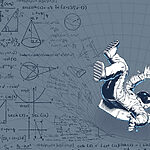 Papel de parede Homem com fato espacial a cair sobre um quadro com equações matemáticas