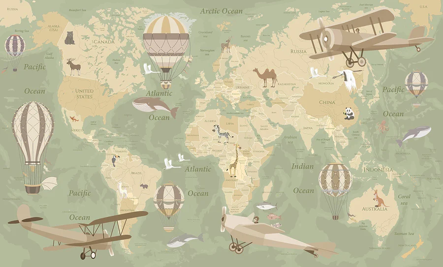 Tem um espaço que precisa de uma faísca? Este mural de parede, "Um mapa do mundo com aviões e balões de ar quente", é como uma viagem mágica à volta do globo sem sair de casa. Perfeito para crianças, não é apenas um mapa - é uma aventura. Voos imaginários em aviões antigos ou flutuações de sonho em balões de ar quente sobre oceanos e continentes, este mural tem tudo. Pense nisso: manhãs com o sol a bater no Oceano Pacífico, tardes a ver uma manada de zebras em África. As crianças podem deixar a sua vontade de viajar à solta, aprendendo sobre diferentes lugares de uma forma tão divertida. É perfeito para despertar a curiosidade - ou simplesmente fazer com que um quarto se sinta super acolhedor e aventureiro. Dá um toque especial a uma parede normal, não acha?