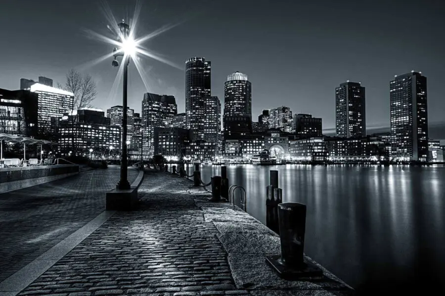 Papel de parede O horizonte de uma cidade com luzes sobre a água