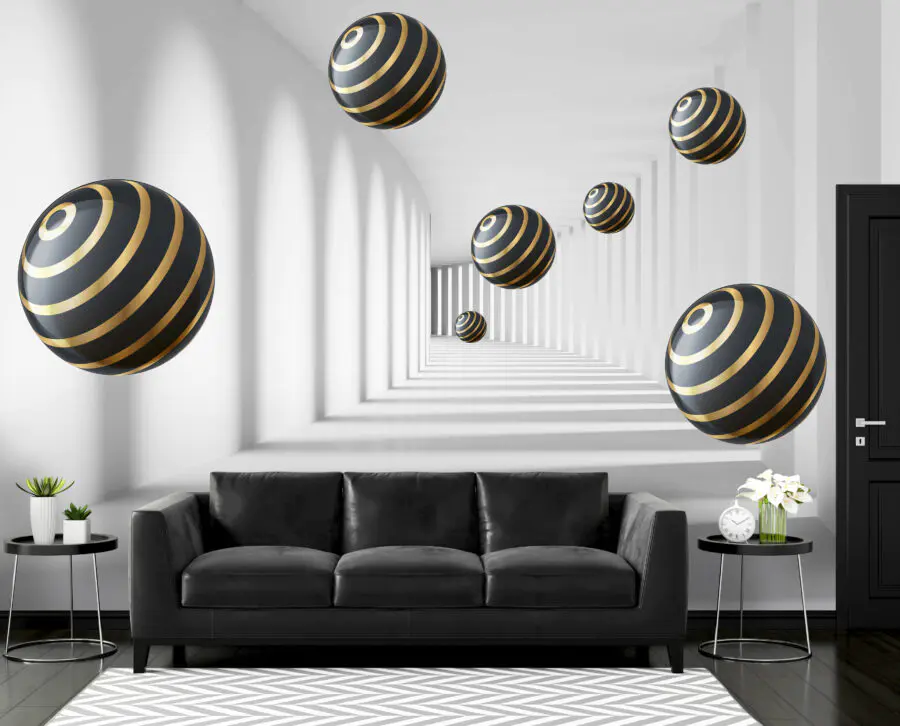 Papel de parede Esferas às riscas flutuam num corredor branco