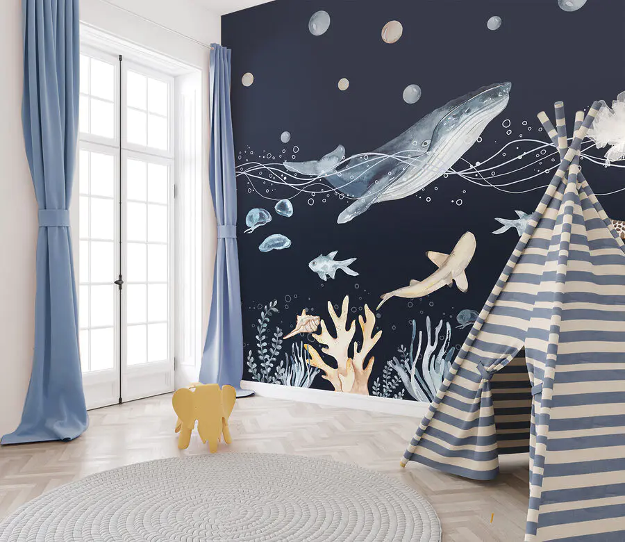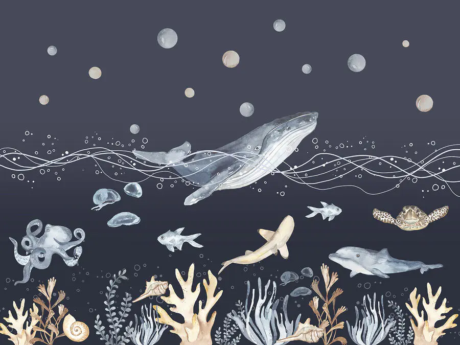 Papel de parede Uma aguarela de uma baleia e de um peixe