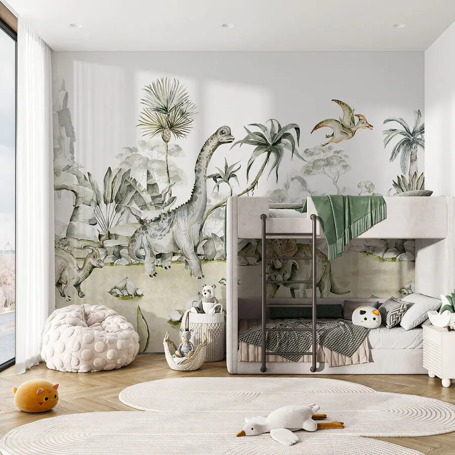 Veja este fantástico mural - é como entrar num sonho de aguarela cheio de dinossauros e plantas exuberantes! Imagine ter isto na sua sala de estar ou no quarto do seu filho. Sempre que entra, é recebido por estes simpáticos dinossauros e uma selva que é simultaneamente selvagem e extravagante. É certamente um início de conversa e, definitivamente, não é algo que se veja todos os dias. As cores suaves e as ilustrações pormenorizadas criam uma atmosfera calma e aventureira. É quase como ter uma mini-aventura no conforto da sua própria casa. Por isso, se gosta de uma decoração única e de um toque de magia da natureza, este mural é a sua combinação perfeita! Pense em todos os devaneios e histórias que ganharão vida com um pano de fundo como este.