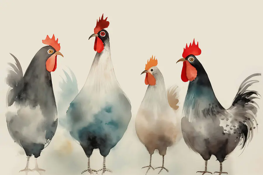 Papel de parede Grupo de galinhas com penas vermelhas e brancas