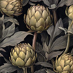 Papel de parede Alcachofras com folhas e caules sobre um fundo preto